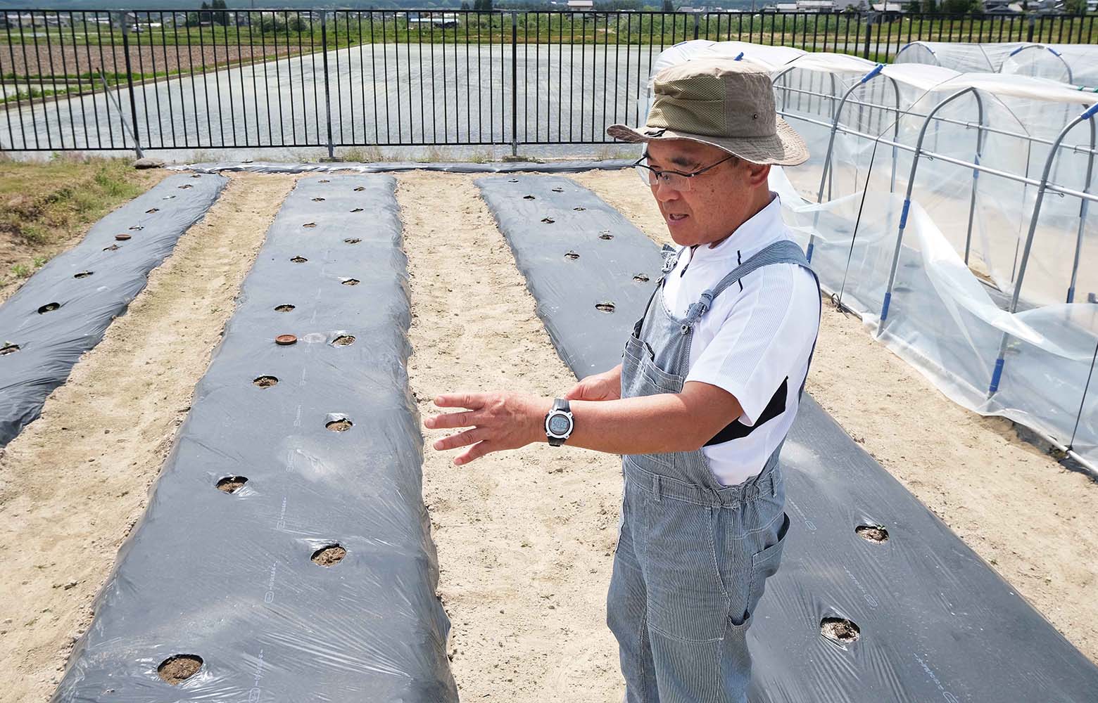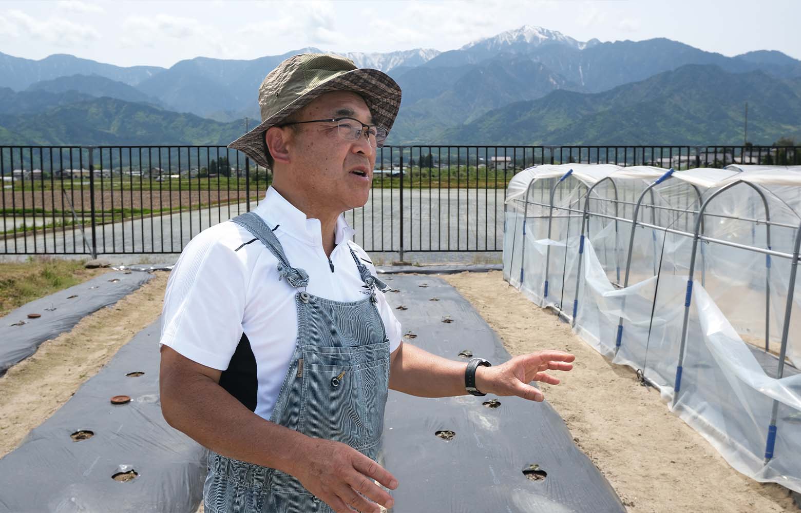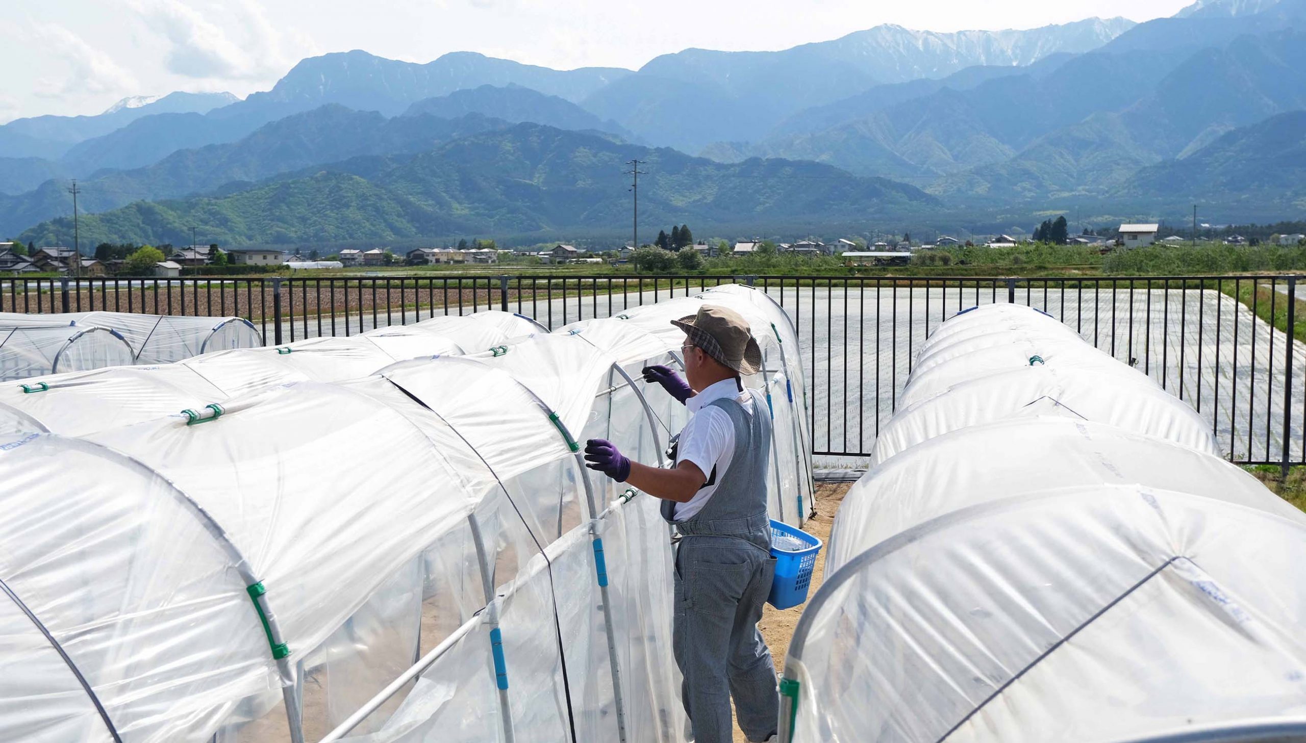 Yes, the work starts in about March. The very first thing I do is to raise the soil with a tractor on all sides and come up with a full blueprint of the field. After that, I spread fertilizer, make ridges, and lay down mulch vinyl, which raises the surface soil temperature and prevents weeds. Then the plastic greenhouses are assembled, after which the seeds are finally sown. I sowed the seeds the other day with children from a local nursery school. Incidentally, apart from seeds, I actually grow and plant seedlings in pots as well. This way, they grow faster and can be harvested. Especially in Omachi, where the weather gets cold early, we still need to do more research on this kind of early cultivation. Once the seeds are planted, it's time to water them. In the beginning, I water almost every day. When the seedlings have grown to a certain extent, I put up a support pole. Cotton trees are vulnerable to wind and heavy rain, so if I don't leave them up, they will fall over. I also control pests. When the tree grows to a certain size, I cut off the branches at a height of 90 cm and grow lateral branches so that the tree will bear more fruit and grow larger. After that, I remove useless branches, weed, and keep an eye on the crop until harvest time. There are other detailed tasks, but this is the approximate flow of the work. On a nice day like today, I lift the overhead vinyl over the greenhouses. It's not always open, but it's raised or lowered depending on the weather.