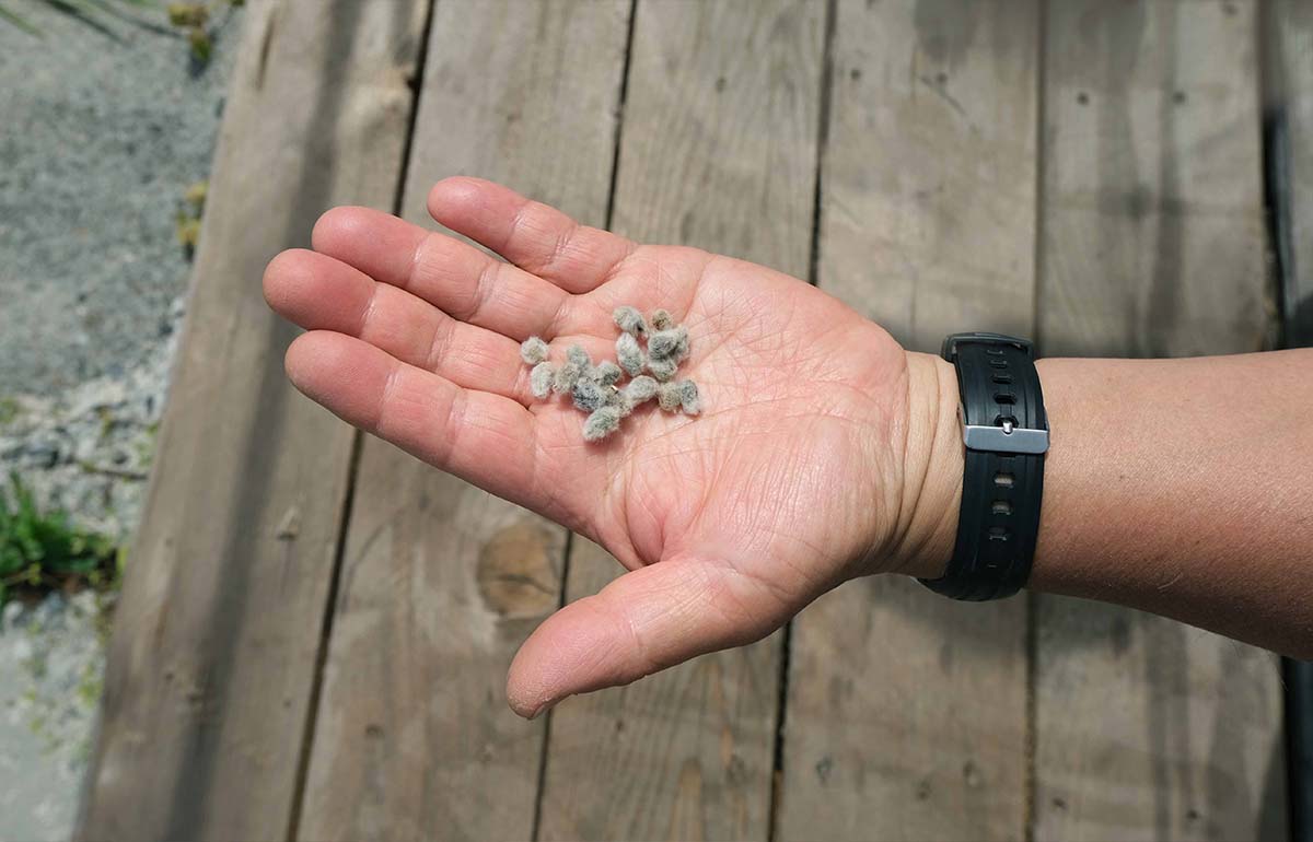We are currently growing a total of 10 varieties of cotton in this field, including Cerves and Upland for upland cotton (*1), Shinshu and Oshima native for Asian cotton (*2), and Japanese cotton (*3). Asian cotton (*2), Japanese cotton (*3) native to Shinshu and Oshima. Colored cotton (*4) includes brown cotton and green cotton. We are also growing hybrids and special varieties on a trial basis. Each has its own characteristics. Japanese cotton, which is resistant to rain, and Selbes, which bears early, are easy to grow, while upland cotton is generally prone to attract pests. Also, Japanese cotton, which until now has been considered unsuitable for spinning, has unique and excellent characteristics, and it would be interesting to make products that take advantage of these characteristics in the future. The seeds also have their own characteristics. Land cotton has larger seeds than Japanese cotton, and depending on the variety, it may be easier or harder to remove the fiber from the seeds during the ginning process.